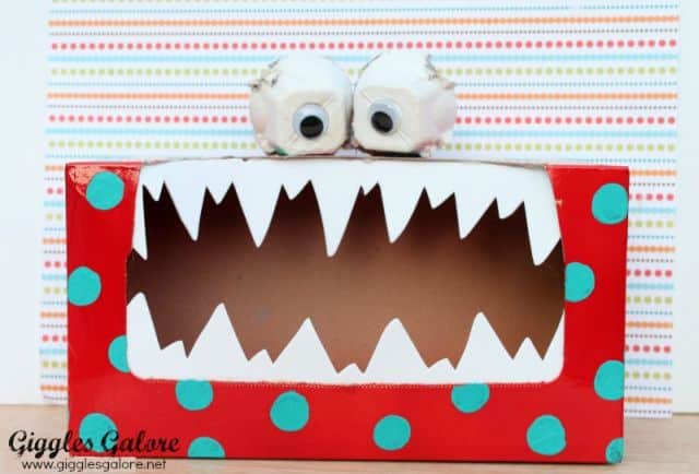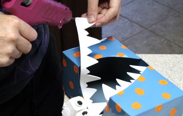 Para finalizar a sua peça, faça uma abertura bem grande, com o auxílio da tesoura, na caixa de papel já pintada, para que você tenha um monstrinho com boca bem grande. E com os dentes já cortados, cole-os com o auxílio da pistola de cola quente no lugar da boca do seu monstrinho. E está pronto seu artesanato!