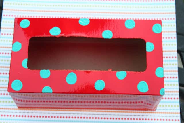 Faça pintinhas ou detalhes que você quiser por toda a caixa e utilizando também as cores que você quiser. Este artesanato infantil com reciclagem pode ter o estilo que você desejar.