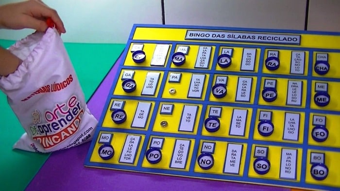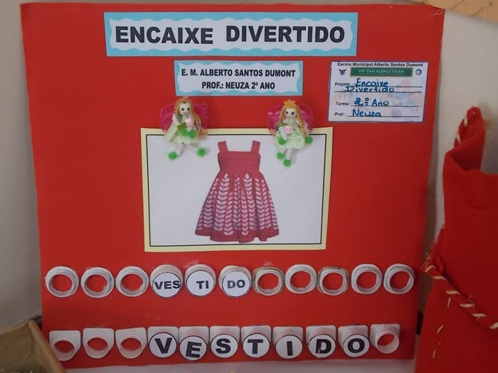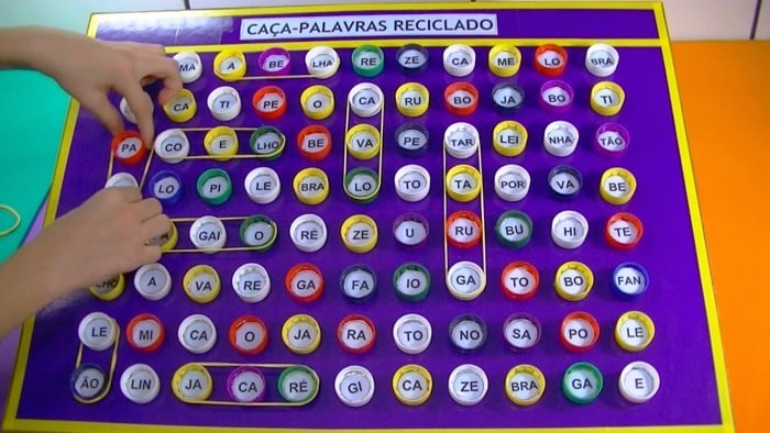 Vale também criar um joguinho de caça-palavras com tampinhas de plástico e elástico, para também ensinar sobre sustentabilidade.
