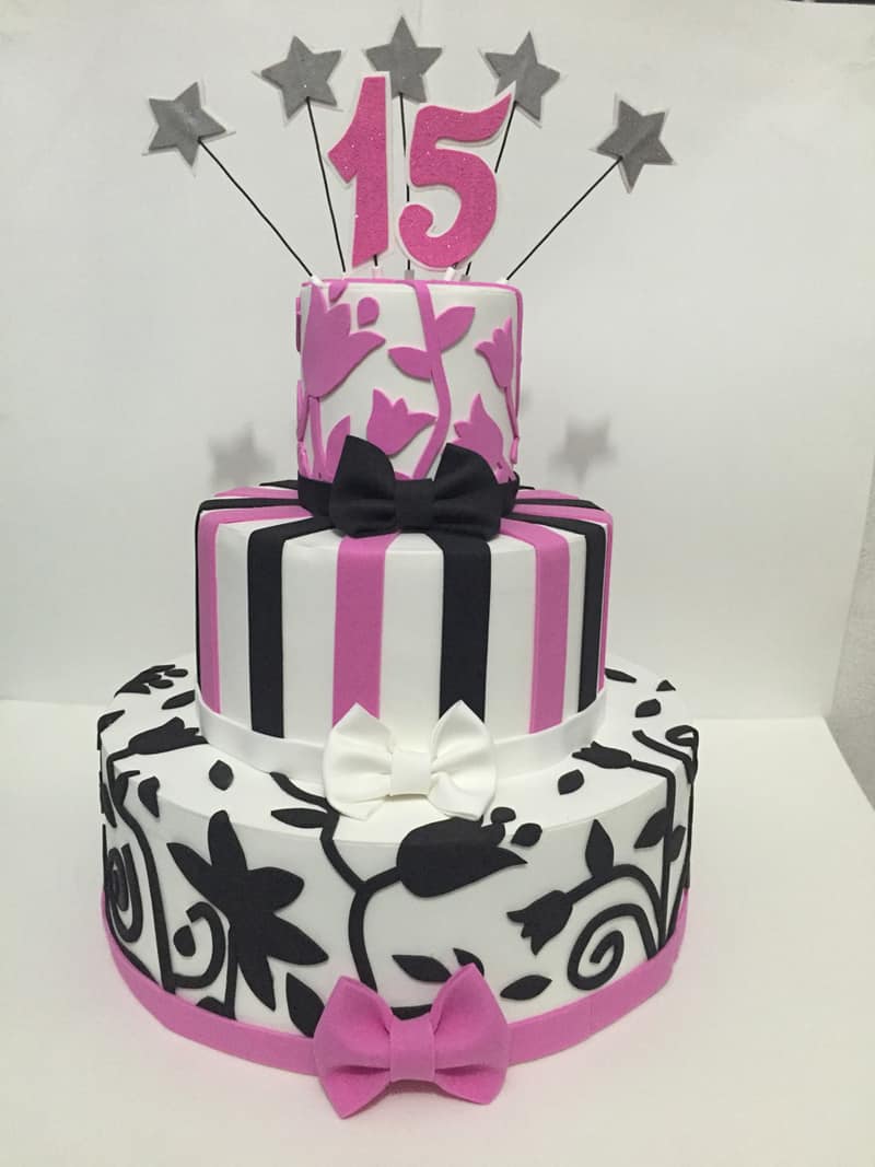 2- Bolo de 15 anos Rosa com Preto e Branco!