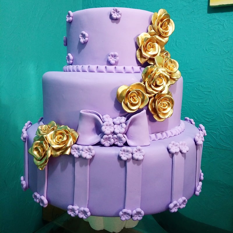 70- Bolo falso feito com pasta americana com flores e laço