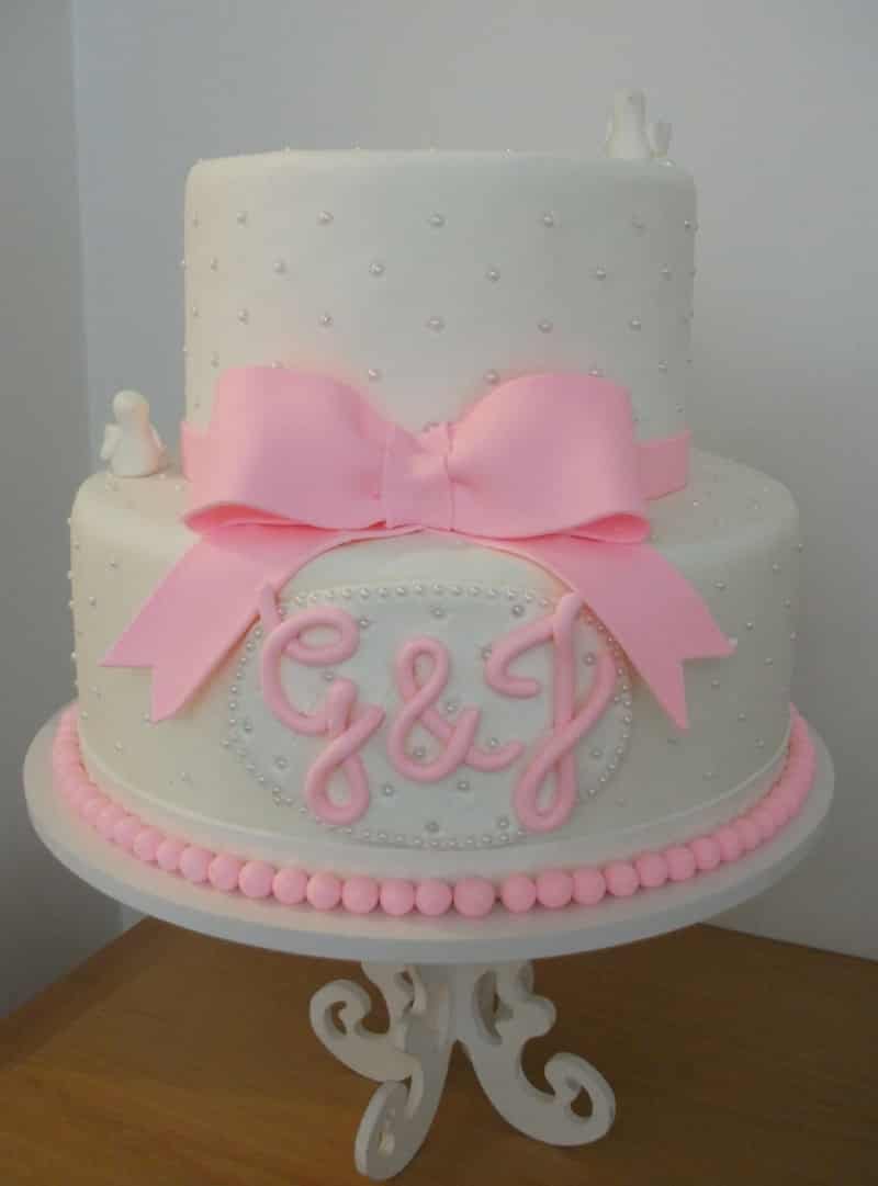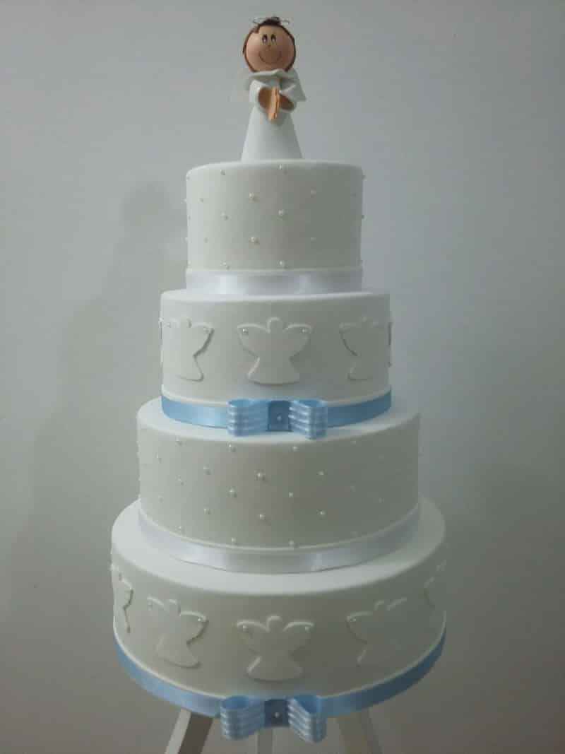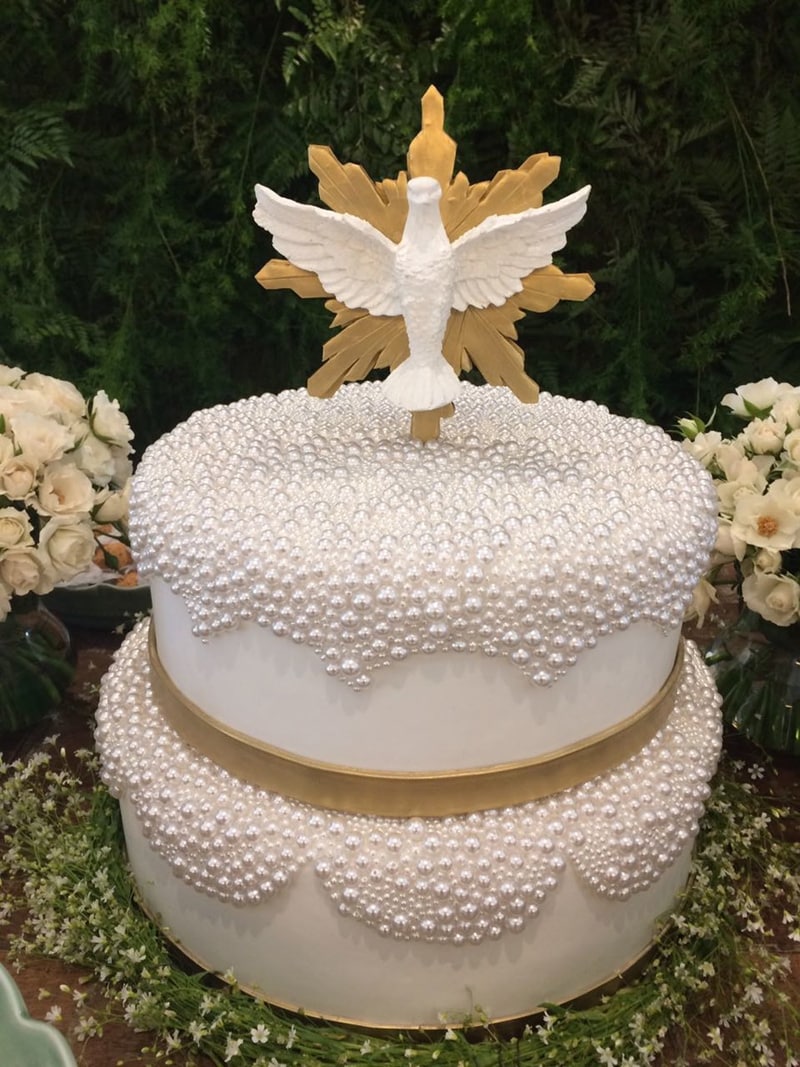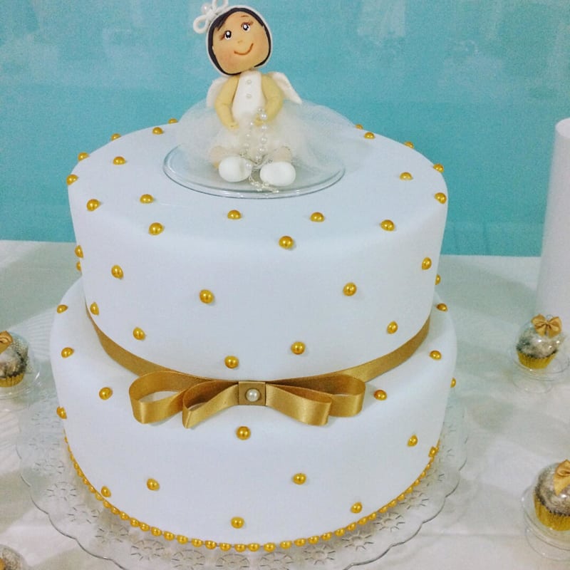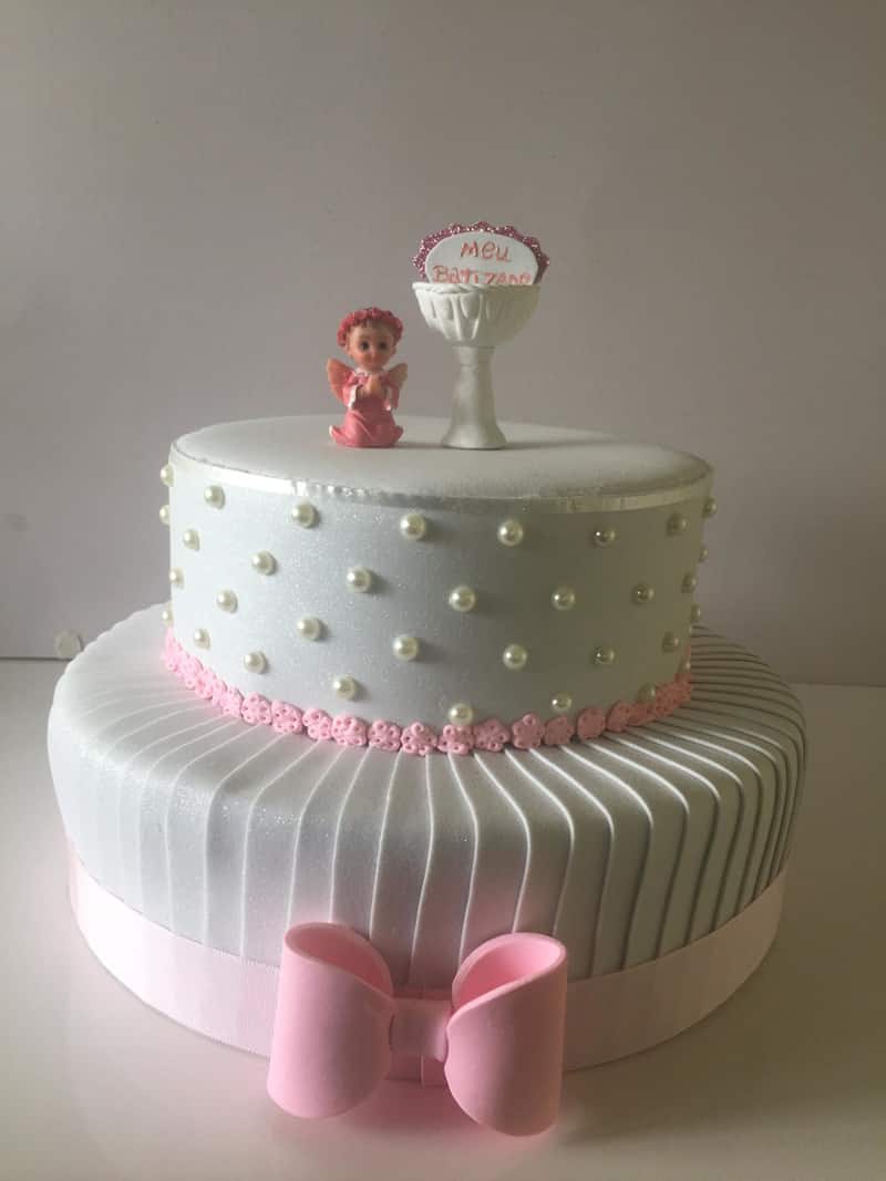 Para as meninas vale abusar penas dos detalhes e deixar o bolo de batizado mais simples, caso goste do estilo mais clássico.