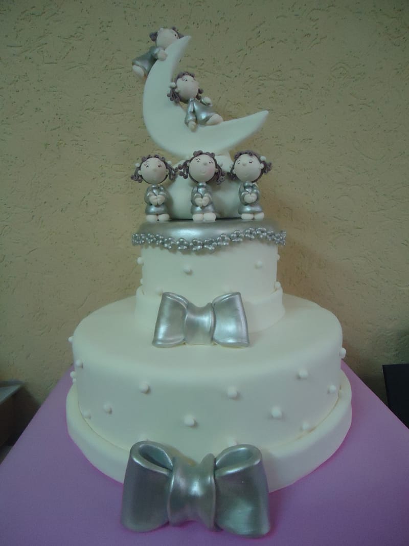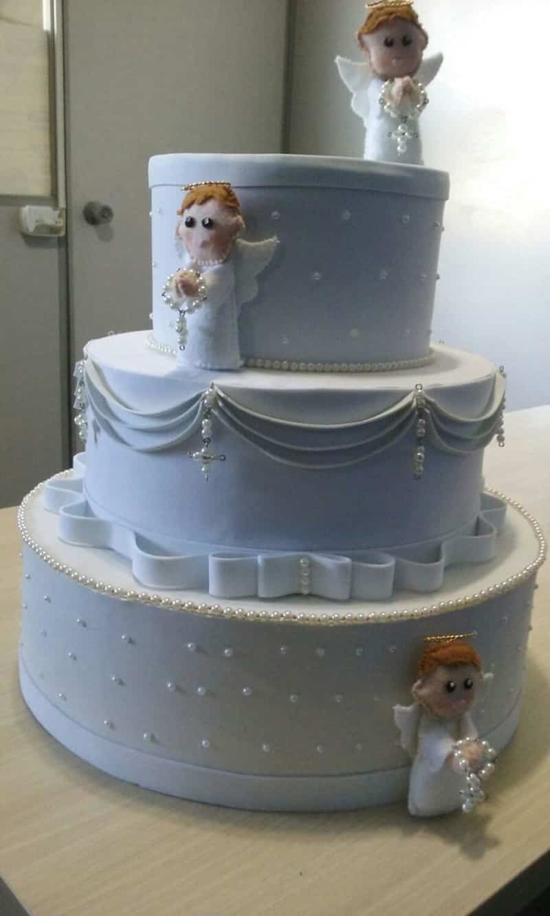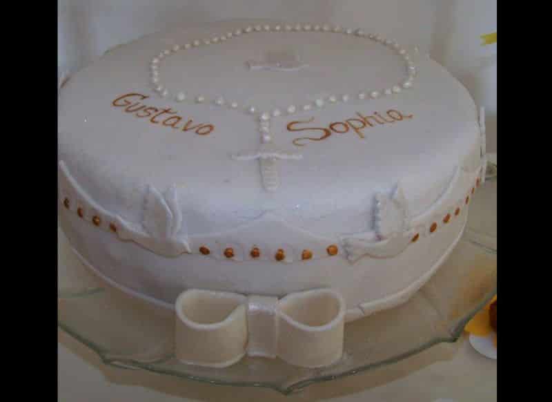 Quem é devoto de Nossa Senhora e gosta de terços, pode também incorporar este elemento religioso ao bolo do batizado. O terço pode ser conseguido através de confeitos espalhados pelo topo do bolo em modelo de tercinho.