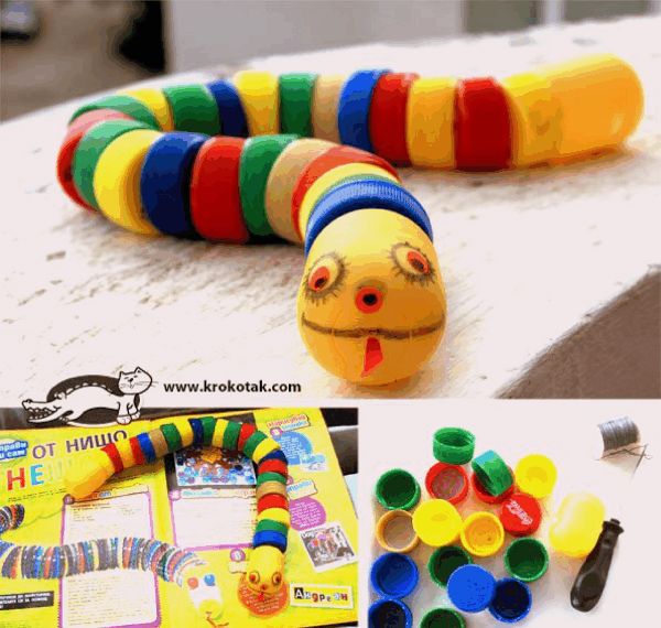Para estimular o tato e a visão dos bem pequenos, faça uma simpática cobrinha com tampinhas de garrafa de plástico. Fure o meio de cada uma e passe um cordão, para ficar maleável. Finalize com tampinhas arredondadas. Decore sua cobrinha como desejar.