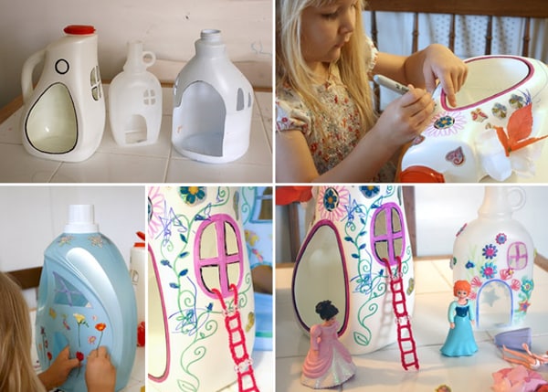 Meninas podem ganhar lindas casinhas de bonecas feitas com embalagens plásticas grandes. E elas vão adorar decorar as casinhas com canetinhas coloridas.