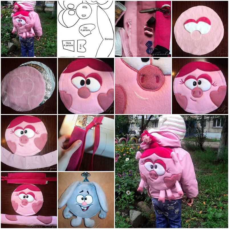 Corte círculos nos feltros e na entretela. Fixe a entretela. Na parte da frente, costure ou borde os detalhes, que pode ser a carinha de uma personagem ou os detalhes que você desejar. Costure as pernas e braços e encha-os. Costure orelhas, se quiser, e prenda todas as peças na parte da frente. Costure o zíper em duas partes e costure esta parte na outra que será a tira lateral da mochila. Costure a tira lateral na parte da frente. Para finalizar a sua peça, abra o zíper e costure a parte detrás. E está pronto!