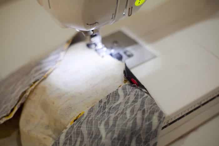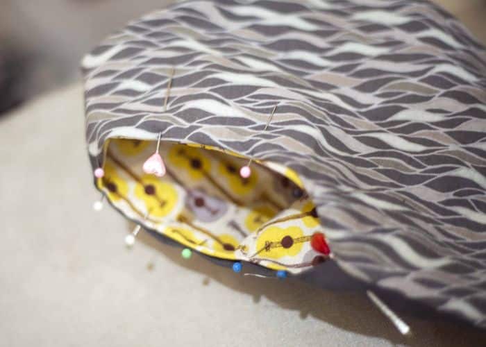 Nas duas cavas, coloque a sobra de tecido da abertura para dentro e prenda com o auxílio dos alfinetes para costura. Costure ao redor das duas cavas.
