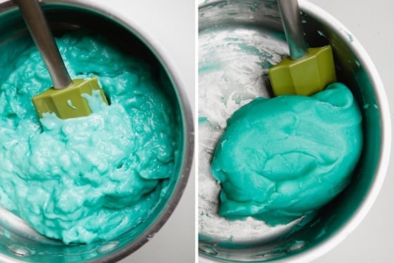 Para finalizar a sua massinha, quando a massa já estiver fria comece a amassá-la, acrescentando farinha de trigo aos poucos, até que pare de grudar nos dedos. E está pronto! Guarde em potinhos.