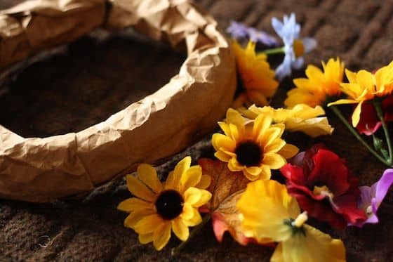 Logo após, comece a colar as flores artificiais já cortadas ao redor da coroa feita de papel, também com o auxílio da pistola de cola quente.