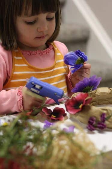 Em seguida, crie uma coroa com os sacos de papel ou com os papéis de sua preferência, com o tamanho condizente com o tamanho da cabeça de sua criança. Enrole bastante papel, formando um tubo, e depois encaixe uma ponta deste tubo na outra e cole as pontas juntas, com o auxílio da pistola de cola quente. Corte os caules das flores artificiais escolhidas, com o auxílio do alicate com corte.