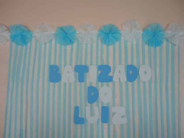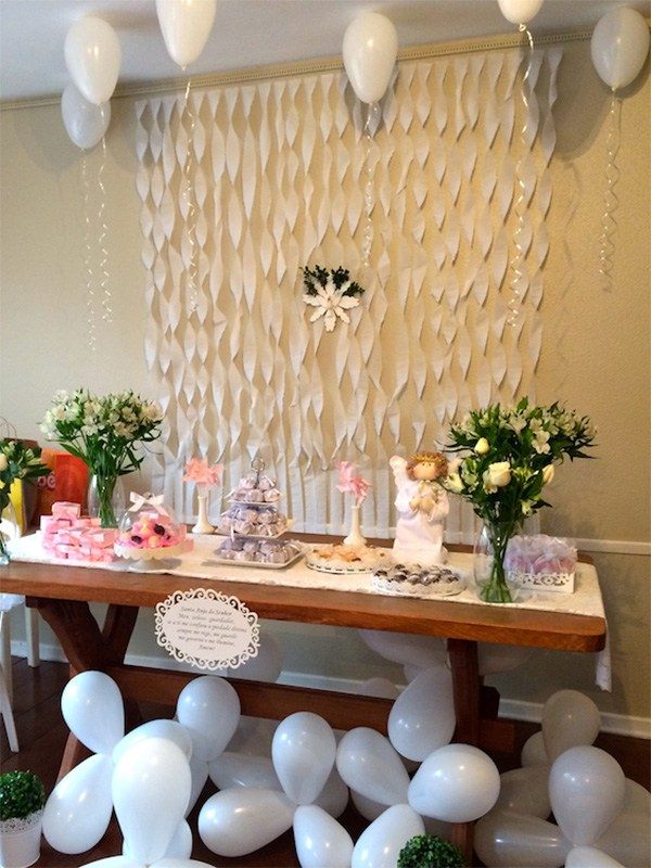 O batismo da sua criança pode ter a comemoração enfeitada com uma linda cortina branca de papel crepom.