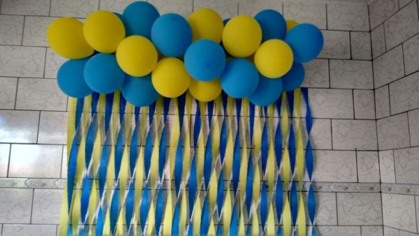 Aposte também em outros elementos decorativos de festas para a sua cortina, como bexigas coloridas, flores feitas de papel, pompons de papel e lanternas de papel, por exemplo.