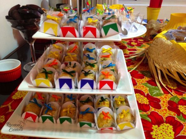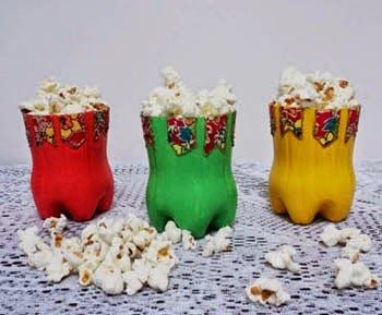 As pipocas e outros alimentos soltos podem ser acomodados dentro de peças descartáveis, como copos ou garrafas pet cortadas, por exemplo, e decorado com o tema festa junina.