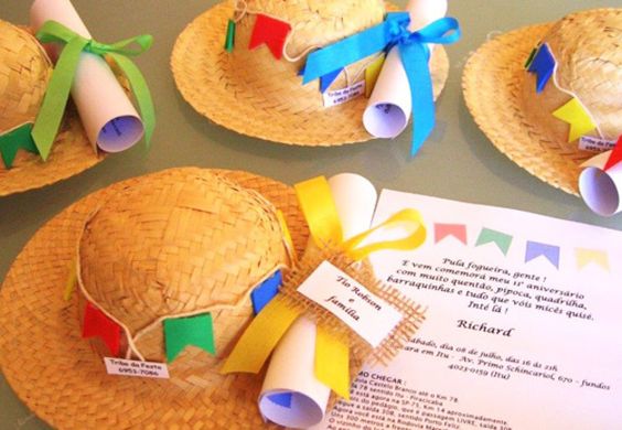 Você pode até mesmo distribuir chapéu de palha para as crianças convidadas, ou até mesmo distribuir roupinhas de festa junina, como vestidinhos coloridos feitos de chita, para as meninas, ou camisa xadrez para os meninos.