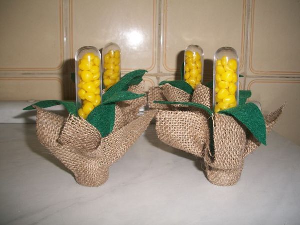 Para criar um visual bonito para os alimentos que você vai servir em sua festa, você pode fazer, por exemplo, um milho estilizado com um tubo de ensaio de plástico recheado de guloseimas amarelas e posicionado de cabeça para baixo dentro de um suporte da sua preferência com algumas folhas verdes ao redor e com um pedaço de juta amarrado envolvendo o suporte, para garantir um toque rústico e mais típico de um milho com palha seca.