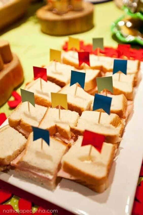 As bandeirinhas típicas de festa junina podem ser usadas também em outras partes do salão e setores de sua festa e não somente no teto. Você pode decorar as colheres, os palitos ou os outros talheres com minibandeirinhas de festa junina bem coloridas, porém com as cores combinando com o restante da decoração da sua festa.