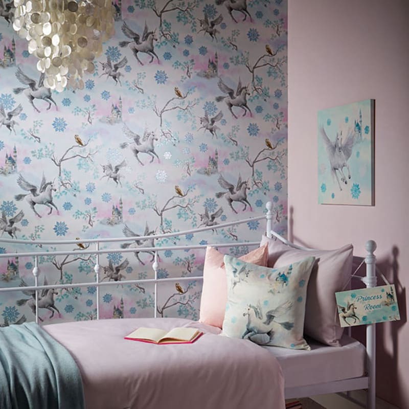 Você pode aplicar o papel de parede em todo o quarto do seu filho ou da sua filha, até mesmo no teto.