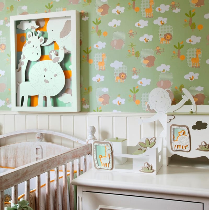 Quem gosta de visual mais discreto pode usar o papel de parede na parte inferior ou superior do quarto infantil.