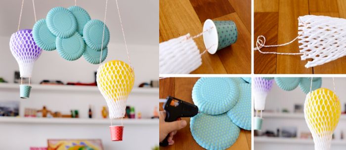 Encha a bexiga e encaixe nas redes. Prenda pedaços de barbante no copo, com fita adesiva. Prenda as outras pontas do barbante na rede com bexiga. Amarre mais barbante na parte superior, para pendurar. Para finalizar a sua decoração, faça uma nuvem com os pratinhos. E está pronto!