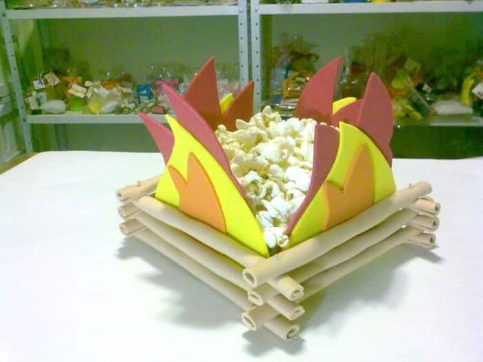 Fogueiras de EVA, topiarias de pipoca, e enfeitinhos com caipirinhas mirins podem decorar as mesas da festinha de sua criança.