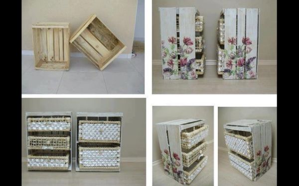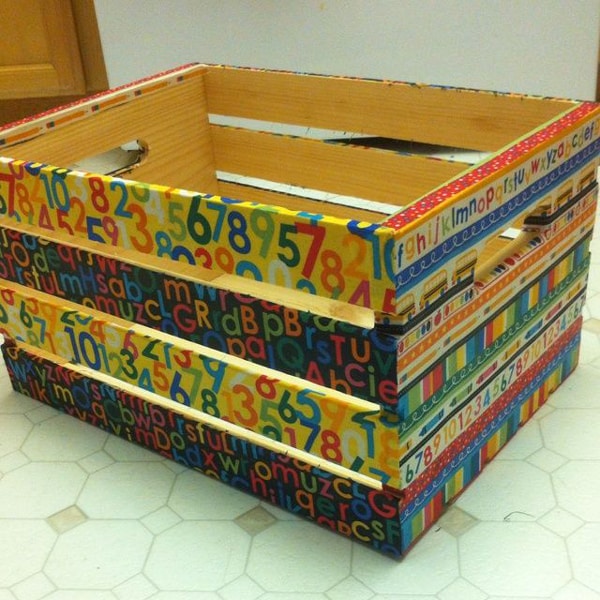 Comece separando todos os materiais que você vai utilizar em seu artesanato. Vá colando pedaços de papel sobre as ripas de madeira, aplicando muita cola para decoupage no caixote. Você pode usar retalhos de papel, se quiser. Após revestir todo o caixote com o papel, aplique mais uma ou duas camadas de cola pra decoupage sobre todo o caixote, para impermeabilizar, porém sempre deixando a cola secar muito bem entre uma camada e outra. Você pode usar este organizador no chão, em um móvel ou na parede. Você também pode substituir o papel por fita adesiva colorida ou estampada.