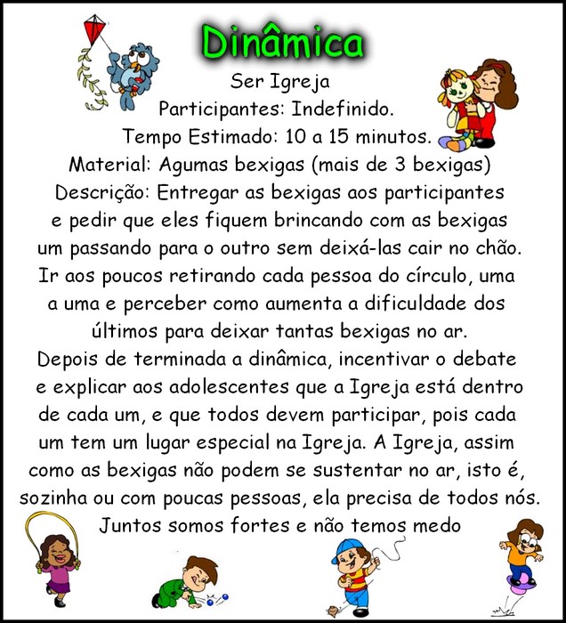 A dinâmica infantil para igreja deve contar com uma “moral da história”, um ensinamento sobre a religião ou sobre uma conduta, como a conduta de sempre oferecer uma boa palavra por onde passar. Neste caso formar-se um círculo com o grupo e uma garrafa é girada por alguém. Em quem a garrafa parar deve receber um elogio ou uma palavra de encorajamento de quem girou a garrafa.