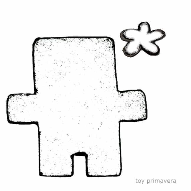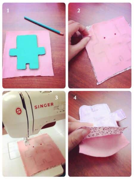 Comece separando todos os materiais que você vai utilizar em seu artesanato. Depois transfira as partes do molde para as respectivas cores do feltro e do tecido escolhidos. Então, posicione uma parte do trabalho sobre a outra, com os lados do direito dos tecidos juntos, para dentro, e costure ao redor, mas deixando uma abertura.