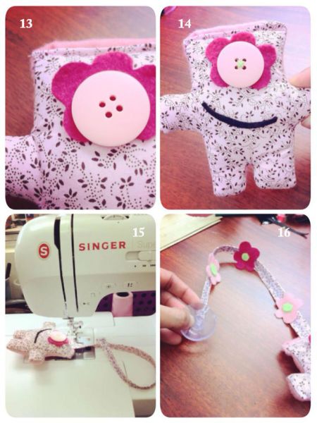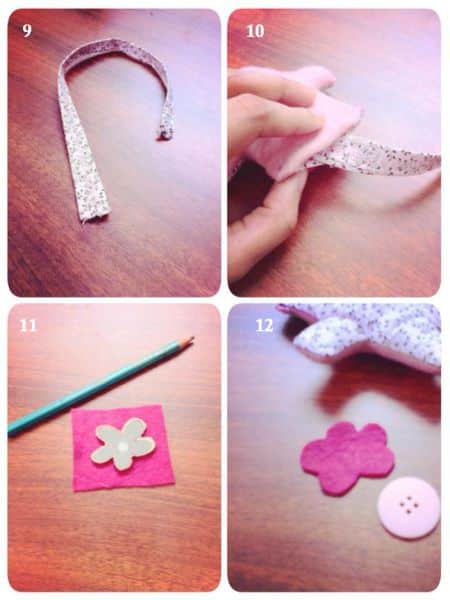 Logo após, costure uma tira de tecido, posicione na abertura e costure. Corte uma flor em um pedaço de feltro.