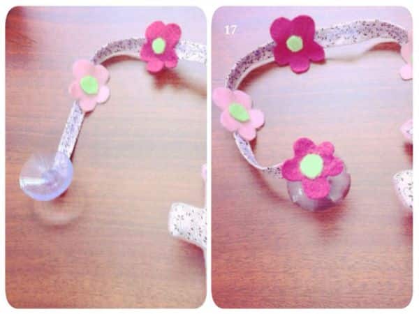 Em seguida, para finalizar a sua peça, termine de fixar flores de feltro na tira de tecido e cole uma flor de feltro sobre a parte traseira da ventosa. E está pronto!