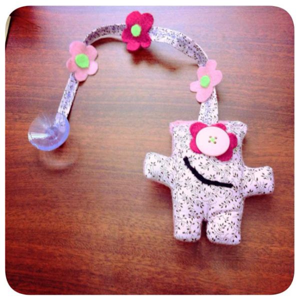Agora, costure um botão sobre uma flor e pregue em seu monstrinho. Costure uma tira de feltro, para simular a boca. E comece a fixar flores de feltro na tira de tecido. Fixe a ventosa na ponta da tira.