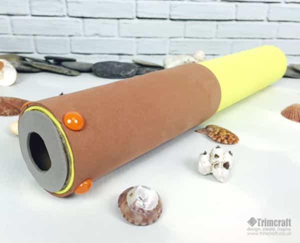 Em seguida, para fazer a luneta, encape o rolo de papel-toalha com o EVA amarelo, depois encape uma das extremidades com o EVA marrom. Na ponta em que está o EVA marrom, cole um círculos vazado de EVA cinza. Para decorar cole botões na extremidade onde está o EVA marrom.