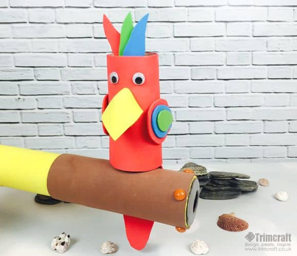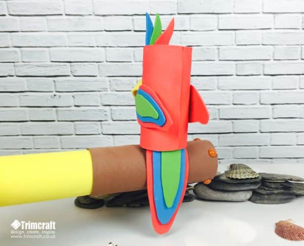 Agora, faça o papagaio. O papagaio é feito com o rolo de papel higiênico sendo encapado e decorado com as partes de EVA. Cole os olhos escolhidos, para finalizar.