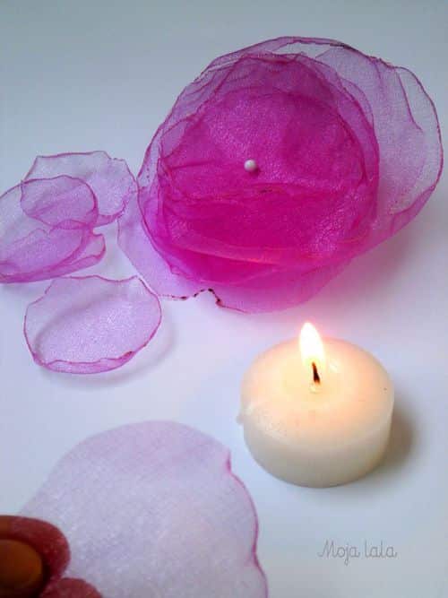 Em seguida, risque alguns círculos com tamanhos decrescentes na organza escolhida. Recorte todos os círculos. Prenda todas as camadas com o auxílio do alfinete para costura, para saber quantos círculos irá usar em cada rosa.