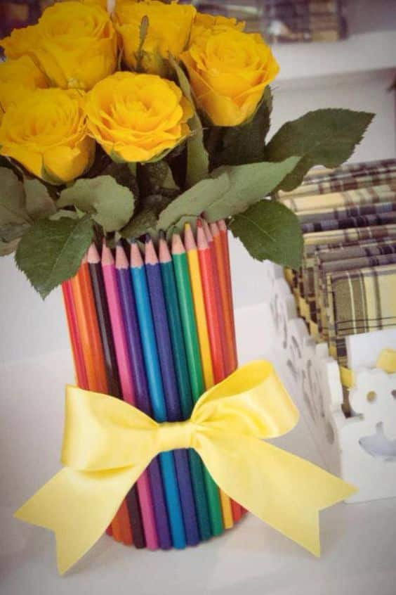 Personalize o vaso que vai receber as flores da sua decoração colando lápis ao redor dele. Vale usar uma lata ou uma embalagem de plástico no lugar de um vaso tradicional.