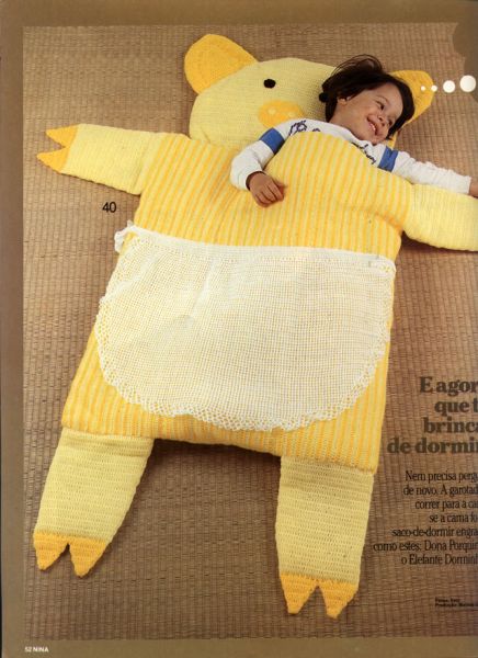 As mães que sabem fazer crochê podem fazer um saco de dormir infantil com modelo de porco, feito com pontos de crochê. Somente com pontos altos, um ponto simples e básico de crochê, você já consegue criar as partes do seu porquinho confortável. A espuma ou um colchonete já pronto, pode ficar posicionado apenas na parte principal e também na cabeça, se você quiser, e as patinhas sendo apenas de crochê, sem recheio.