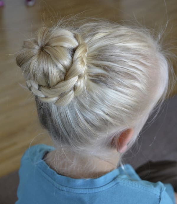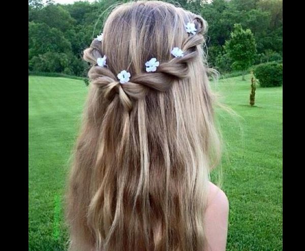 Se você quer um penteado que deixe as pontas dos cabelos soltos, faça um rabo de cavalo comum em sua menina, na altura que quiser. Faça uma trança no comprimento do rabo de cavalo, mas deixando pontas soltas durante todo o processo. Prenda a ponta. Enrole a trança ao redor da base do rabo de cavalo, mas tendo cuidado de não embolar as pontas soltas, e prendendo muito bem com vários grampos. Use babyliss nas pontas soltas. Se quiser, coloque uma flor ou outro acessório no penteado.