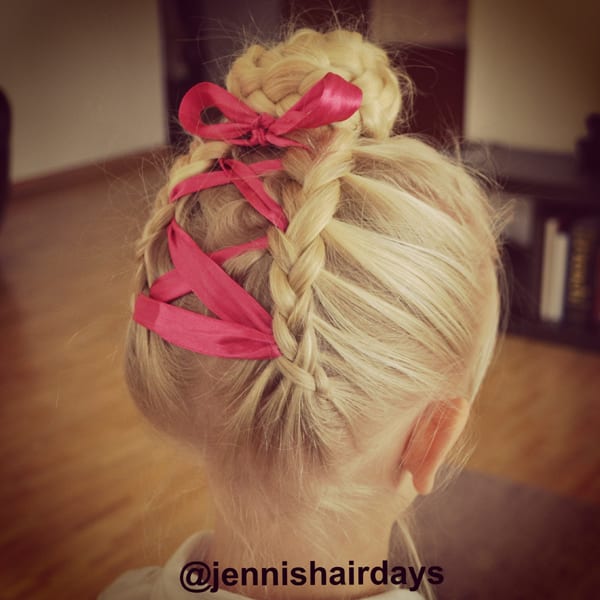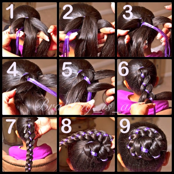 Se você quer um penteado todo preso para a sua menina ir a alguma festa, faça também um rabo de cavalo. Em meio ao comprimento do rabo de cavalo prenda uma fita com a cor que você quiser. Vá trançando todo o comprimento do cabelo de forma normal, fazendo uma trança comum. Prenda a ponta, ao final do trabalho. Agora, basta enrolar a trança ao redor da base do rabo de cavalo, prendendo muito bem com vários grampos.