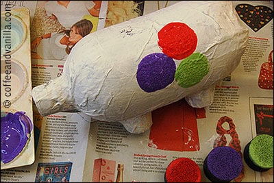 Pinte toda a sua peça de branco. Deixe secar muito bem e comece a decorar o seu porquinho, fazendo círculos sobre ele, com o auxílio de carimbos e tintas coloridas, ou com o material que você desejar.