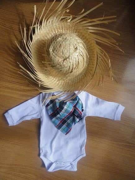 Para os meninos é bem simples montar um traje caipira. Vale usar camisa xadrez, calça jeans (que pode também possuir rasgos ou tecidos coloridos aplicados) e um chapéu de palha. Se ainda quiser incrementar o look, vale fazer uma barba falsa com rolha queimada. Seu menino também pode investir em um estilo mais country, com chapéu mais moderno, cinto, botas, e a camisa xadrez.