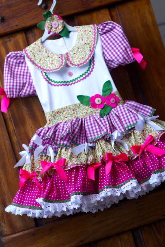 O vestido caipira mais tradicional é o vestido de chita, este tecido barato, mas bem chamativo e colorido, é o melhor aliado no momento de confeccionar a roupa de festa junina. Escolha uma estampa com cores que mais agrade a sua menina e faça um vestido com saia bem rodada e mangas bufantes. Para espantar o frio, a sua menina pode usar um vestido de festa junina com meia calça de fio grosso e um bolero combinando com o vestido.