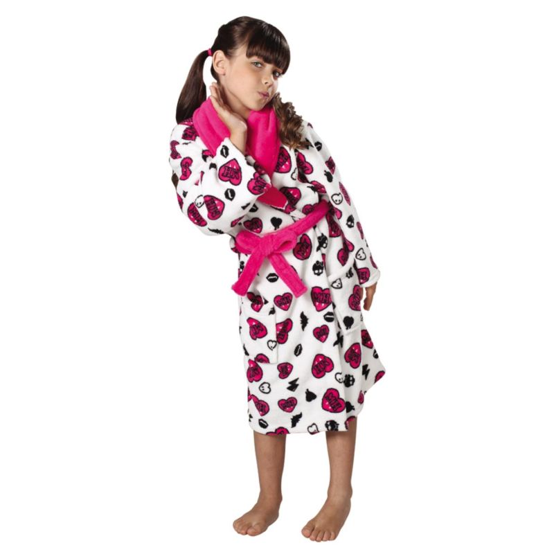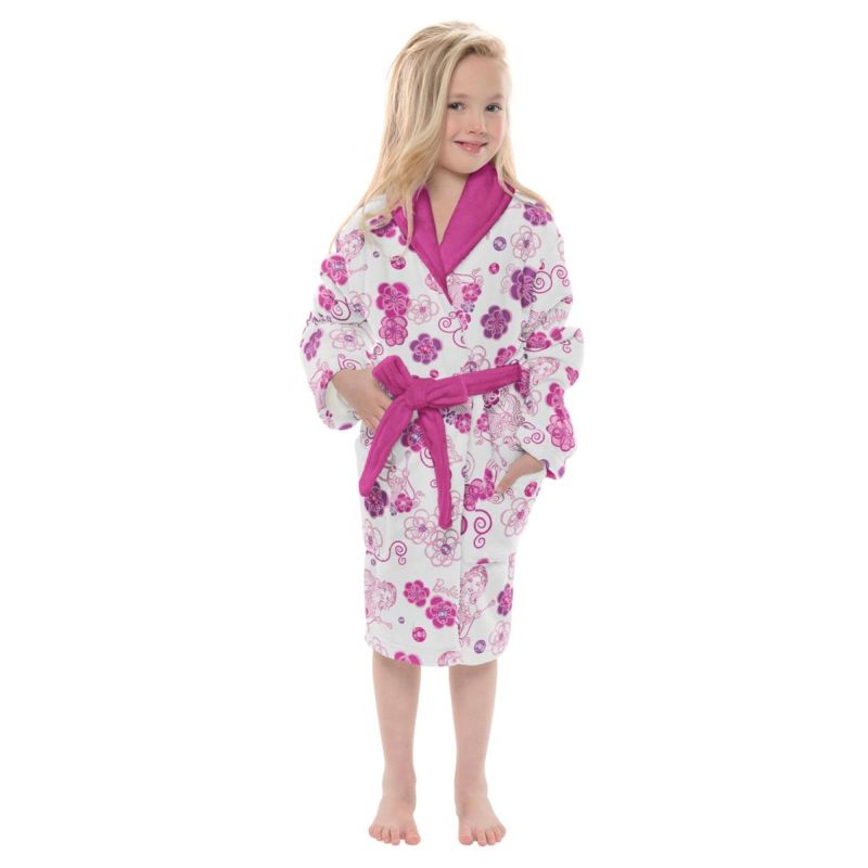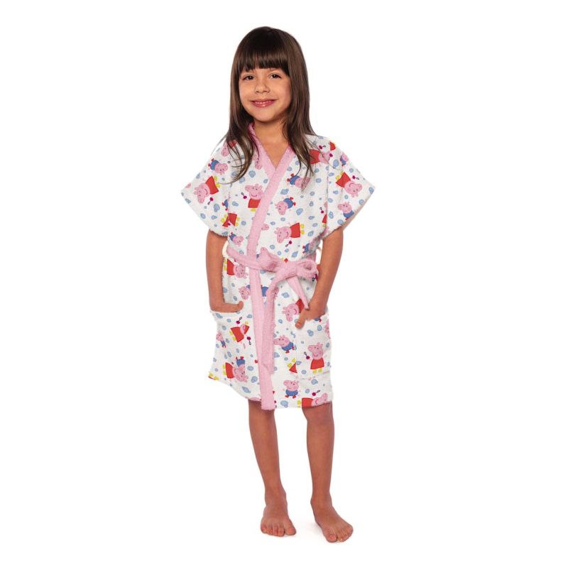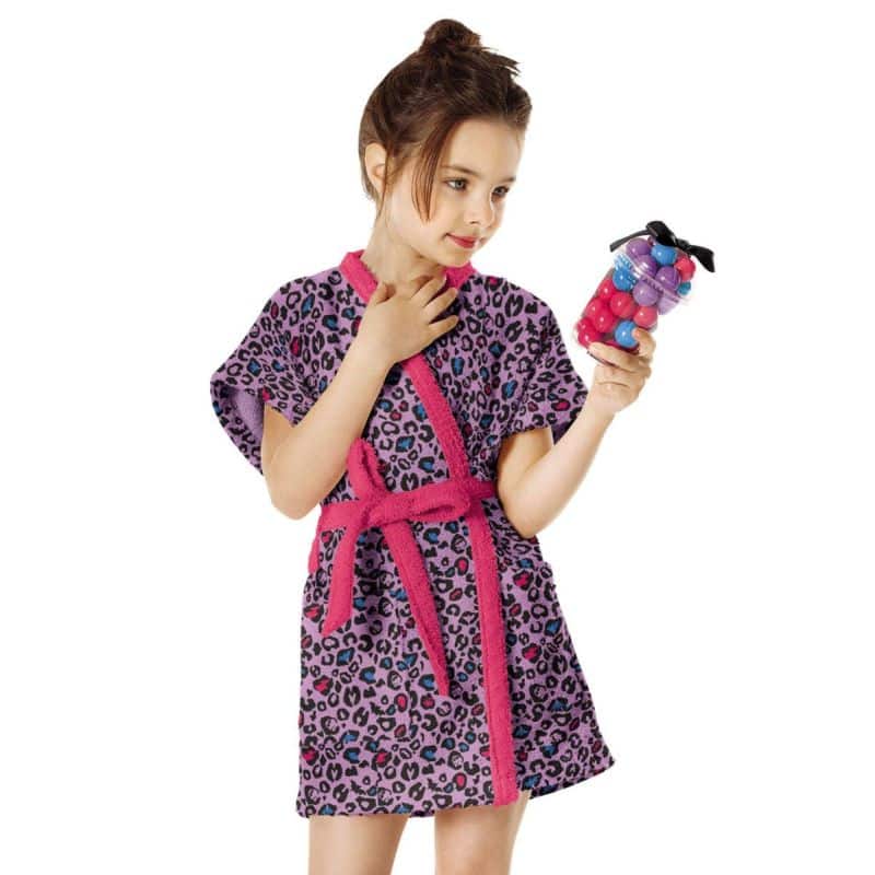 As garotas vão ficar muito charmosas e ainda mais encantadoras com um roupão com estampa de oncinha colorida com detalhe pink. A estampa de onça fica mais infantil com pontos coloridos em meios às manchas de onça e com cor de fundo lilás. Roupão felpudo com manga curta é ótima opção para os dias quentes e ensolarados do verão.