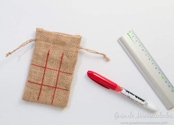 Logo após, risque um jogo da velha em uma das partes da sua sacolinha, com o auxílio da caneta para tecido e da régua.